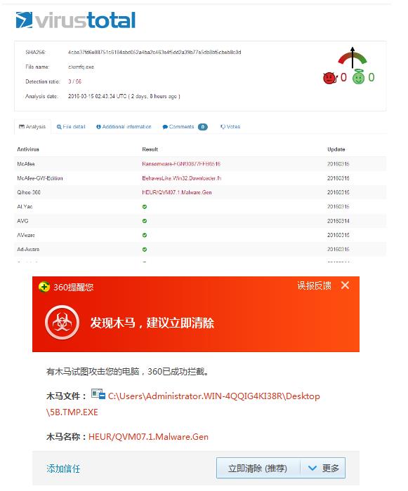 根据VirusTotal(谷歌旗下的在线杀毒扫描平台)检测,目前仅有McAfee和360能够检测最新的敲诈者病毒,360对该病毒的检测结果是HEUR/QVM07.1.Malware.Gen,这意味着搭载了QVM引擎的360安全卫士和360杀毒都能够防御和查杀该敲诈者病毒。