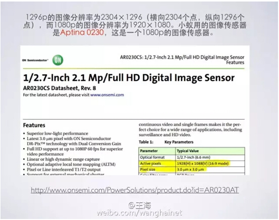 正是上面这个图像传感器的参数,让小蚁露出了狐狸尾巴。虽然小蚁避而不谈所用的图像传感器型号,但它写出了单个像素的尺寸为3x3um,其含义就是单个像素尺寸比较大,突出感光能力强,所以夜视效果好。