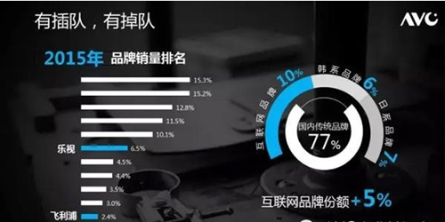 2015年中国彩电业进入调整期,品牌格局重新洗牌。AVC数据显示,2015年国内传统品牌的市场零售份额为77%,较去年下降3.8个百分点;互联网品牌的市场零售份额为10%,较去年上升5.1个百分点;韩系日系品牌,较2014年下降0.5和0.8个百分点,互联网品牌市场份额在2015年有快速的提升。