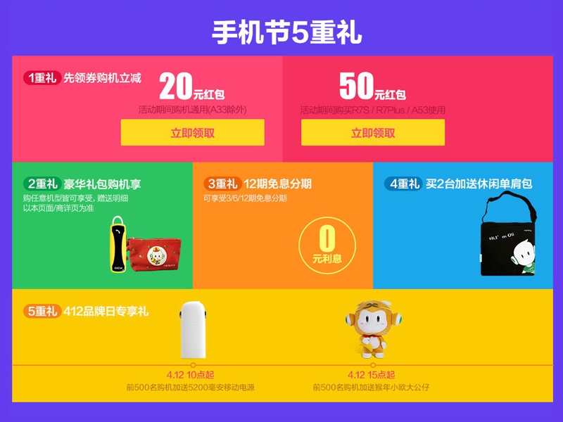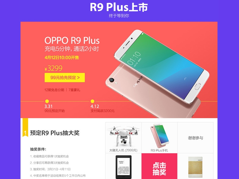 当然更为重点的,则是OPPO R9 Plus的预约活动。OPPO官网预约R9 Plus即有机会赢取手机。首销期间更有5重好礼相送,包括领券购机立减、豪华礼包购机享、12期免息分期、买2台送休闲单肩包和412品牌日专享礼等,让用户享受更多实惠。