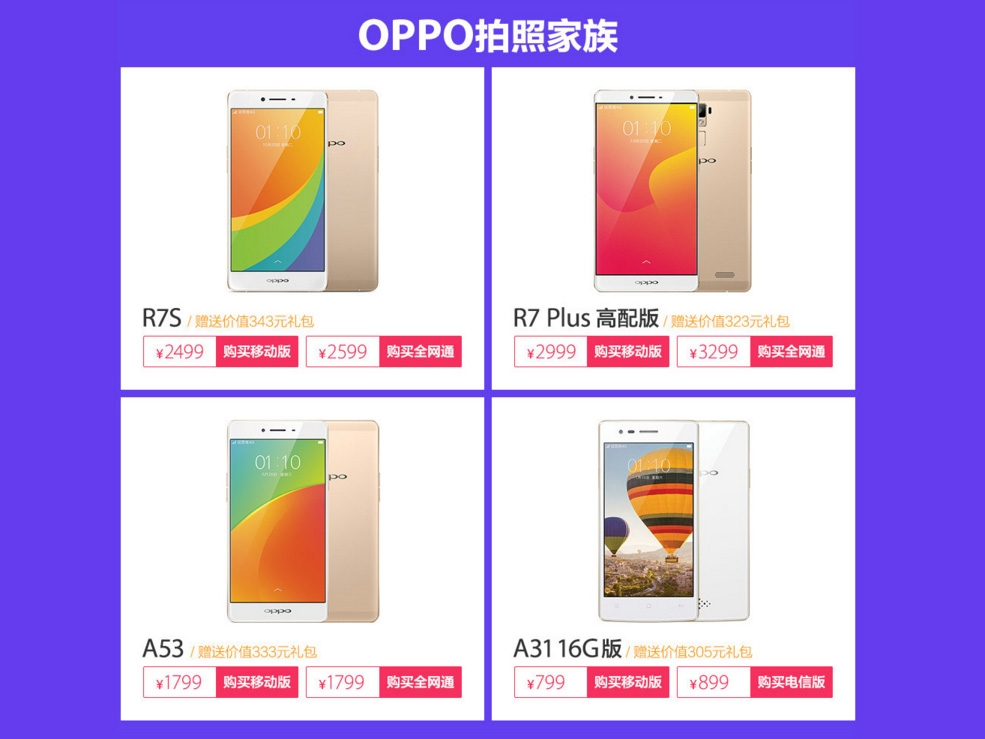 此次参加OPPO手机节的还包括了OPPO拍照家族,OPPO R7s、OPPO R7 Plus高配版、OPPO A51和A31 16GB版都有着价值超过300元的礼包赠送!那么多OPPO手机一起搞促销活动真是难得,还不赶快抓紧机会,前来购买!