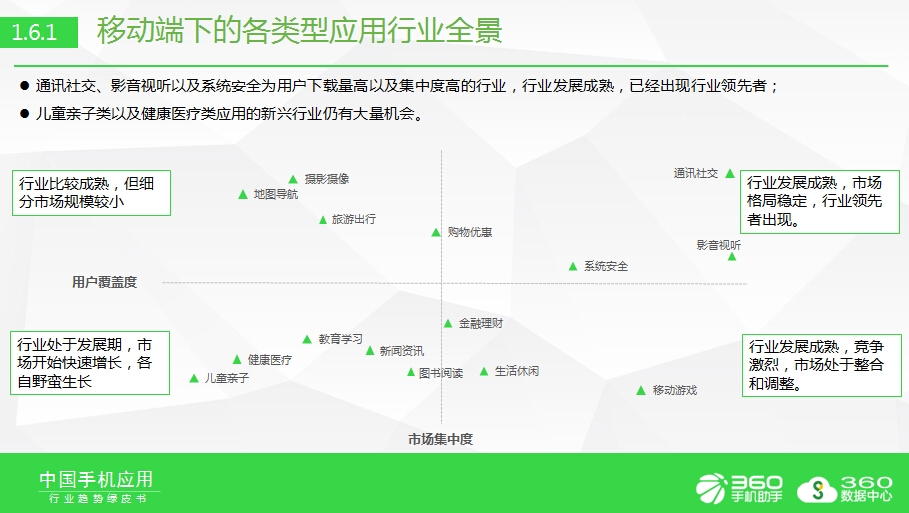 绿皮书指出,在当前的移动互联网领域,通讯社交、影音视听以及系统安全为用户下载量高以及集中度高的行业,行业发展成熟,已经出现行业领先者;而儿童亲子类以及健康医疗类应用的新兴行业仍有大量机会。