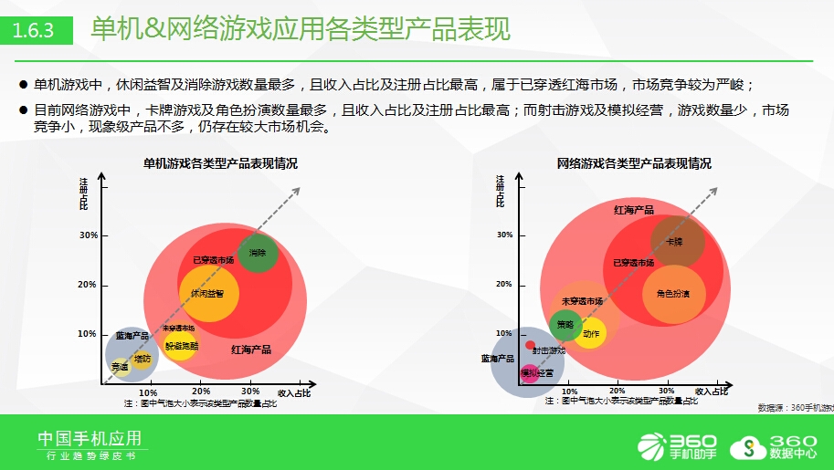 绿皮书指出,单机游戏中,休闲益智及消除游戏数量最多,且收入占比及注册占比最高,属于已穿透红海市场,市场竞争较为严峻;目前网络游戏中,卡牌游戏及角色扮演数量最多,且收入占比及注册占比最高;而射击游戏及模拟经营,游戏数量少,市场竞争小,现象级产品不多,仍存在较大市场机会。
