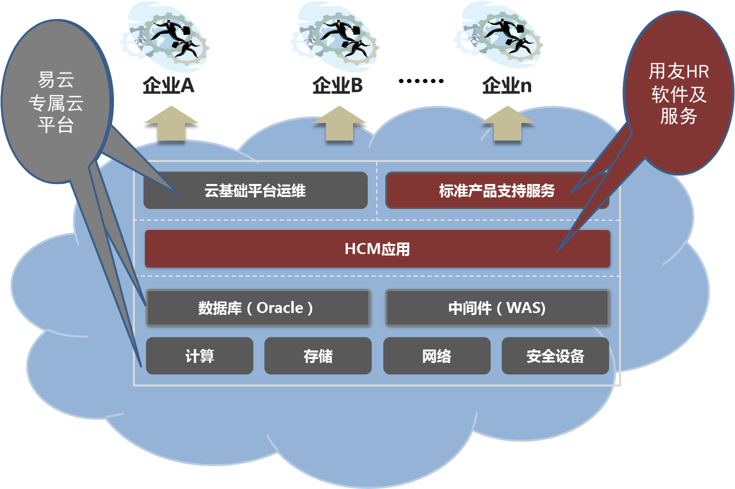 易云股份的专属云服务已经成功为中国人力资源管理软件第一品牌用友HCM实现了云化转型。易云股份改变了用友HCM原有的License销售模式,将HCM应用全部部署在云服务器上,以按使用付费的形式向企业用户出售管理软件。在用友HCM原有软件架构基础上,将基础设施云服务整合到产品中,实现了快速商用的软件云化。目前易云已为诸多政府部门、军工、文创等行业中大型企业提供了全面的云计算服务和一站式解决方案。