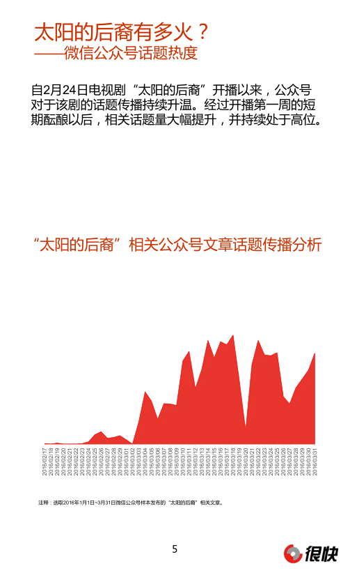 周播剧《太阳的后裔》自2016年2月24日开播以来,便开启霸屏模式,欧巴吸睛,CP给力,无论是百度搜索指数,还是微博话题讨论量,火热程度居高不下,成为娱乐焦点。【很快】大数据平台发布《“太阳的后裔”微信公众号数据洞察报告》,从微信大数据层面深挖《太阳的后裔》舆论热点,剖析各微信公众号主体如何“借势营销”。