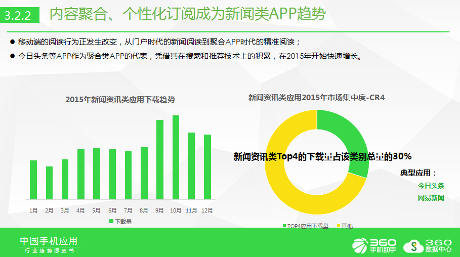与以往获取信息的方式有所不同,绿皮书指出,移动端的阅读行为正发生改变,从门户时代的新闻阅读到聚合APP时代的精准阅读;如今日头条等APP作为聚合类App的代表,凭借其在搜索和推荐技术上的积累,在2015年开始快速增长。