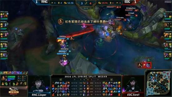 第二局,急欲锁定胜局的RNG开局就掀起了一波波攻势,而EDG则更沉着冷静的蓄积着自己的团战优势,抓住时机与对手展开凶猛对攻。在前期上路爆炸的情况下,EDG没有选择上局的稳妥发育,而是不断在寻求机会主动求战。最终凭借近乎疯狂的输出,第28分钟,EDG以漂亮的一波,带走RNG,将比分改写为1:1。这也成为了本场比赛一个重要的战略转折点。