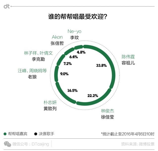 从投票结果来说,容祖儿和徐佳莹的帮帮唱朋友陈伟霆和林俊杰的粉丝号召力果然强大。