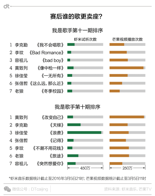 从赛后虾米音乐试听次数和相应芒果视频播放次数来看,黄致列的视频播放次数在两期中都是遥遥领先。