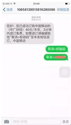 根据网友所述,他的手机忽然收到一条短信:来源为“1065800”的号码发来了一条短信杂志。接着,来源为“10086”的号码发来了一条短信,提醒他“开通了中广财经半年包业务”。同时发来的还有一条“余额不足”的短信。正在他纳闷时,来源为“10658139013816280086”的号码发来了一条短信:您成功订阅了中国移动的(中广财经)40元/半年,3分钟退订免费。如需退订请编辑短信“取消+校验码”至本条短信退订。”署名“中国移动”。