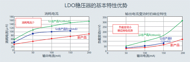 新产品的基准电压电路和放大电路等采用ROHM独有的电路技术,同时实现了仅为以往产品一半的低消耗电流35?A和更佳的响应特性(负载变动65mV)。
