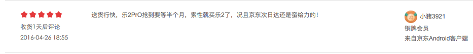 当然好产品更需优秀的服务保障,在万条好评中,消费者对于京东近乎完美的服务给予了充分的肯定,纷纷发表了“京东快递速度逆天”、“乐2首发京东竟然能抢到现货”等类似好评。京东移动商店更是给力送,创下了从用户下单到拿到手机仅4分钟的物流记录!