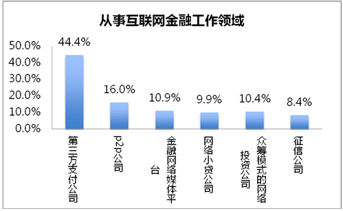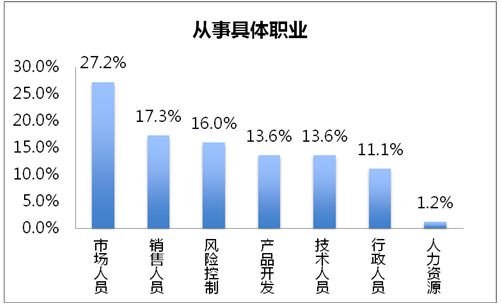 那么这些互金从业者都集中在哪些具体领域?又从事具体那个工种较多呢?调研显示,从事比例最高的是第三方支付公司占44.4%,其次是p2p领域占16%。而主要的职业角色比例最高的是市场人员占27.2%,依次是销售人员占17.3%,风险控制占16%。可见这个互金行业中的热门领域及职业特点。