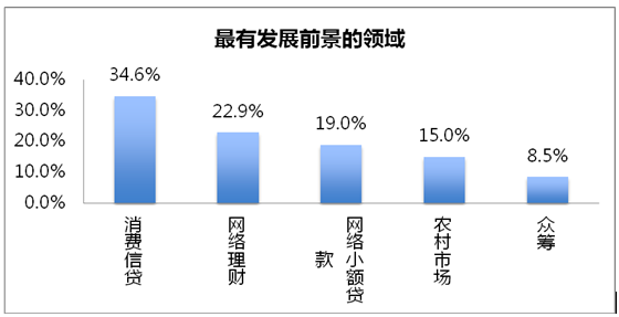 另外,本次调研从业者也对互金行业中未来发展最有前景的细分领域进行了预测,认为最有前景的领域是消费信贷,占34.6%;第二是网络理财,占22.9%;第三是网络小额贷款领域,占19%。