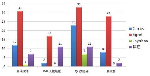 从新浪微博,爱微游,QQ浏览器以及WiFi万能钥匙等主流渠道统计的数据来看。Egret、Cocos2d-js引擎的占据了绝大部分市场份额。