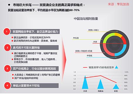 全中国现有加油站数目超过10万座。其中,50%加油站为民营油,但由于缺乏规模、品牌和营销手段,运营效率低下,平均销量水平仅为两桶油的60-70%。迫于在激烈市场竞争压力及技术、成本限制,只能将精力都放在了集客和销售上,对于精细管理和流程改造力不从心。比如对客户细分及精准营销方面缺少最基本的能力,造成“获客难、留客难”困局。