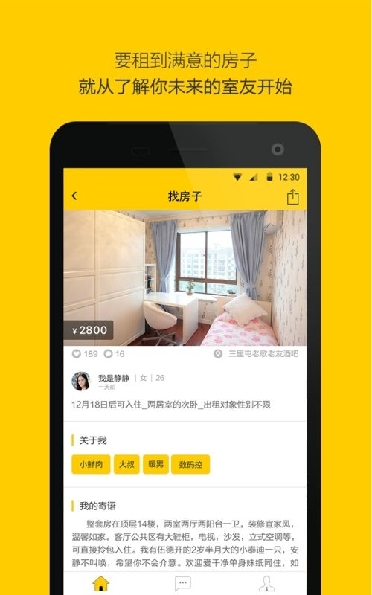 有了心仪的室友,还要找到心仪的房子,才能在一整天的繁忙工作后,让身心充分放松,为第二天的工作提供动力。“室友”房源均经过“租客认证”,真实性高,能够有效过滤不良中介,避免不必要的麻烦。租客只要通过生活圈、地铁线、预算等筛选条件,即可有针对性地找房,查看房源照片,了解房源和房东情况,简化找房过程,节省精力。对于已经有房的人,可以上传自己以及房子的信息,让近期想要租房、找室友的人迅速联系自己。