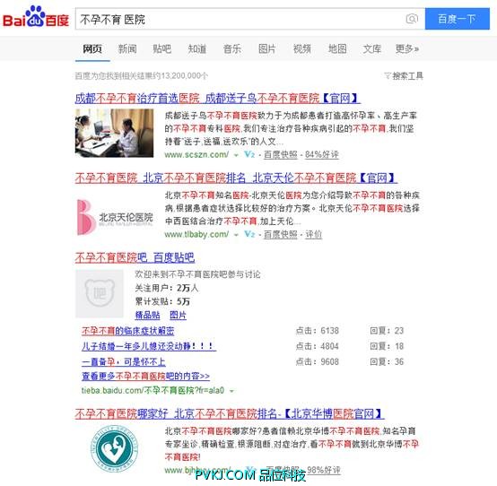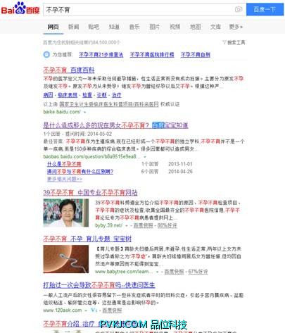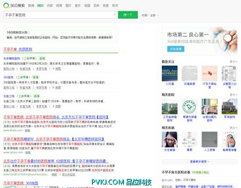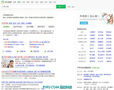老周突如其来的一封公开信让360搜索在这次事件中显得非常亮点,但是具体的搜索结果方面,SO靠谱的360搜索表现如何呢?首先,我们打开360搜索,尝试“不孕不育”关键词,得出结果如下: