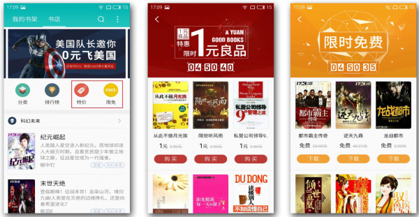 作为Flyme的“后起之秀”,“读书”在给用户送福利方面也不甘落后,推出了“1元良品限时特惠”“限时免费”等活动,简单而直接地让喜爱读书的用户受益。