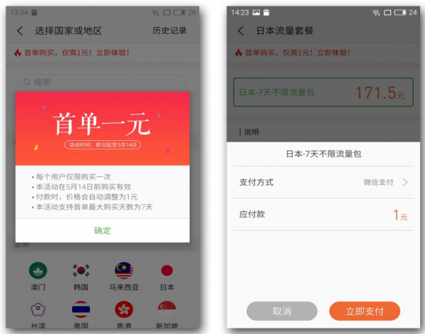 与国内主流相关服务提供商和有类似服务的厂商相比,Flyme用户可以以更低的价格享受国际流量服务。这还不够,Flyme另外推出了“首单一元”的活动。在5月14日之前,首单购买用户花费一元钱即可购买7天不限流量包。例如,原价171.5元的日本7天不限流量包,首单购买的用户只需花费一元,省了170元之多。有此需求的用户不要错过。