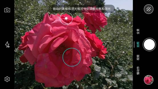 虽然对焦测光分离并不算常用功能,但是在微距拍照时使用概率也并不低,如果单独隐藏在功能设置中还会有一定的不便。因此,乐视超级手机EUI拍照界面中的对焦测光分离功能并未单独设立功能开关按键,用户仅需长按对焦点即可实现分离测光,并且能够实现多次拖拽,方便用户寻找最合适的测光点。