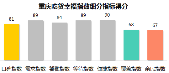 尤其以人们心目中的美食之都重庆来看,在吃货幸福城市百强排名中甚至居于中后位置,原因何在?从报告的七大细分指标来看,重庆的排名主要受亲民指数和覆盖指数拖累。从亲民指数(可支配收入/餐饮消费)来看,按照2015年城镇居民可支配收入计算,重庆吃货可外出就餐约550次,约为南京的1/2;从来源于人均餐厅拥有量的覆盖指数来看,虽然重庆餐饮业发达,但由于重庆人口数量位列全国城市之首——常住人口超过3000万——导致每万人餐厅拥有量低于全国平均。