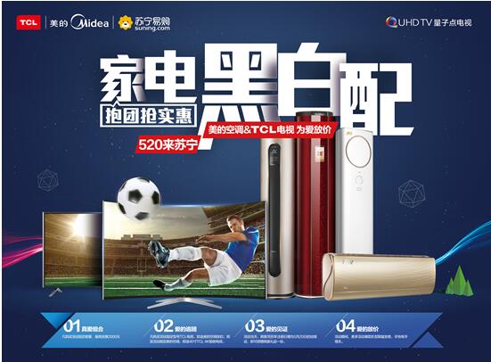 但面对这样的购物难题,TCL跟美的为消费者给出了一个直切痛点的完美答案。此次TCL电视与美的空调两大品牌跨界联合,通过整合双方渠道资源、产品搭配,为全国消费者带来优惠力度空前的福利,让消费者同一时间同一终端享受黑白家电两件套的超值选购机会,省钱又省心。苏宁副总裁表示,为配合两大家电巨头实现历史性的“黑白牵手”,苏宁将在渠道、服务、价格等各个方面给予大力支持,在全国开启TCL电视和美的空调520黑白配直通车,势必为消费者带来一场舒心超值的购物体验!