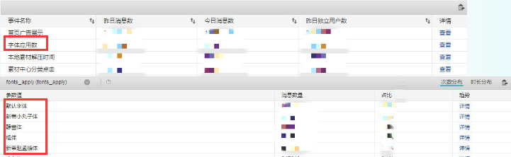 美图秀秀在使用【友盟+】服务时,就是根据自定义事件细化用户行为,通过埋点事件数据的多少并结合当下流行趋势来决定推出的标签及顺序。比如它统计了自定义事件“字体应用数”,了解用户使用“字体”这个功能按钮的点击次数、使用了哪些字体、最受用户欢迎的字体有哪些等,然后进行设计与功能的调整。同时,美图秀秀通过事件转化率来判断广告页转化情况,变现能力一目了然。