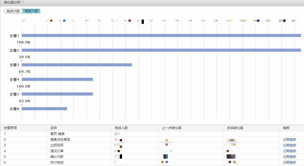 以电商类直接可变现的App付费率为例,从用户进入商品详情页到支付成功,投资人可根据“上一步转化率”了解用户每一步用户使用行为转化率,根据“总体转化率”结合业务目标衡量该款应用整体的盈利能力。可对应用付费转化率进行渠道和版本查看。