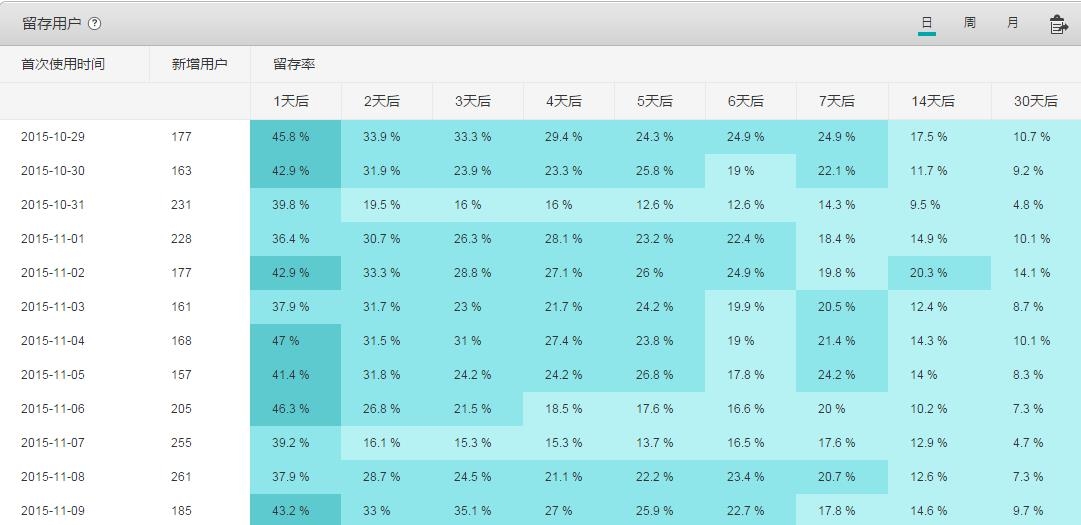 不同性质的App留存率有不同的衡量标准,比如像工具、教育等性质的应用整体留存率相对会高一些。而有些应用是不需要每日启动的,此时建议可以对比查看周留存率、月留存率等指标评估用户粘性。比如像旅游类,医疗类等。如果一款App没有体验或者性能上的硬伤,没有做任何推广活动下,次日留存率30%—40%,7日留存率大概为次日留存率一半,30日留存率大概为7日留存率一半。是一个正常的留存率数据。下图颜色较深表示留存率越高,颜色越浅留存率越低。并可分渠道和版本查看留存率。