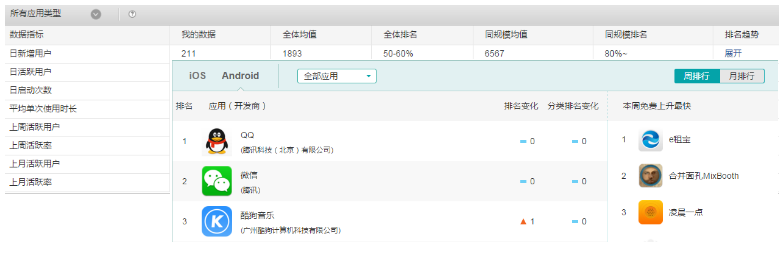 此外,行业数据也是个重要指标之一。它能帮助投资人了解行业内应用的整体水平,可以对比查看本应用在全体应用或同类应用中各个指标的数据、排名及趋势,有助于衡量应用的市场竞争力。