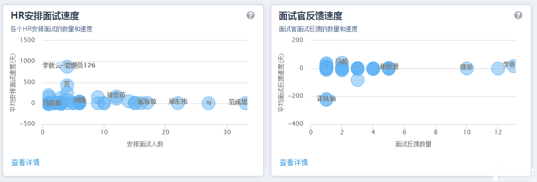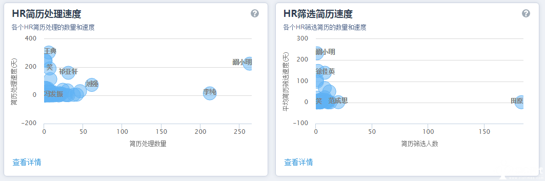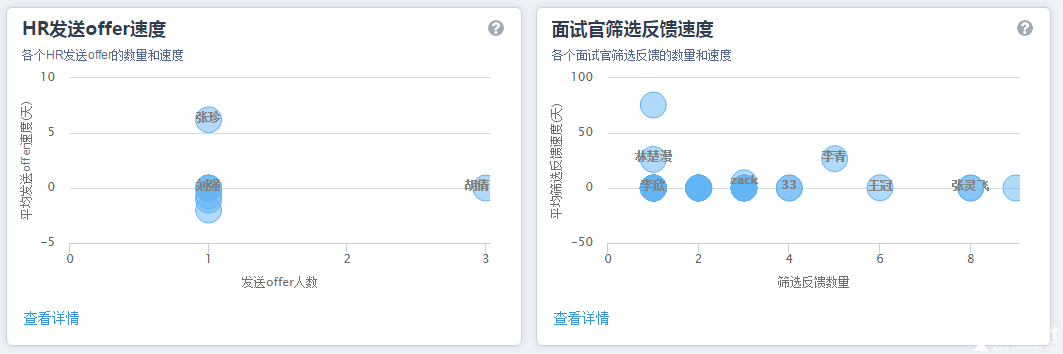 2、HR和面试官的工作效率分析:通过HR简历处理速度、安排面试速度、发放offer速度以及面试官处理速度的数据整合,直观反馈每位HR或面试官的招聘效率。