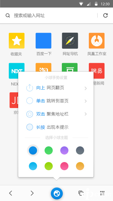 这个小球键也是星尘浏览器的一大特色。可以通过单击设置成翻页,双击设置成收藏夹,上滑设置成聚焦地址栏,还可以长按小球进入自定义设置,通过小球翻页效率很高。一个小球键的功能如此全面,用户体验也多了很多乐趣。笔者注意到,星尘浏览器是基于Chrome内核开发的,不同于很多其他主流浏览器把主页做成新闻资讯入口,而是类似Chrome的最常访问主页。可以看出,研发团队超卓科技有意让星尘浏览器保持了纯粹的特性。