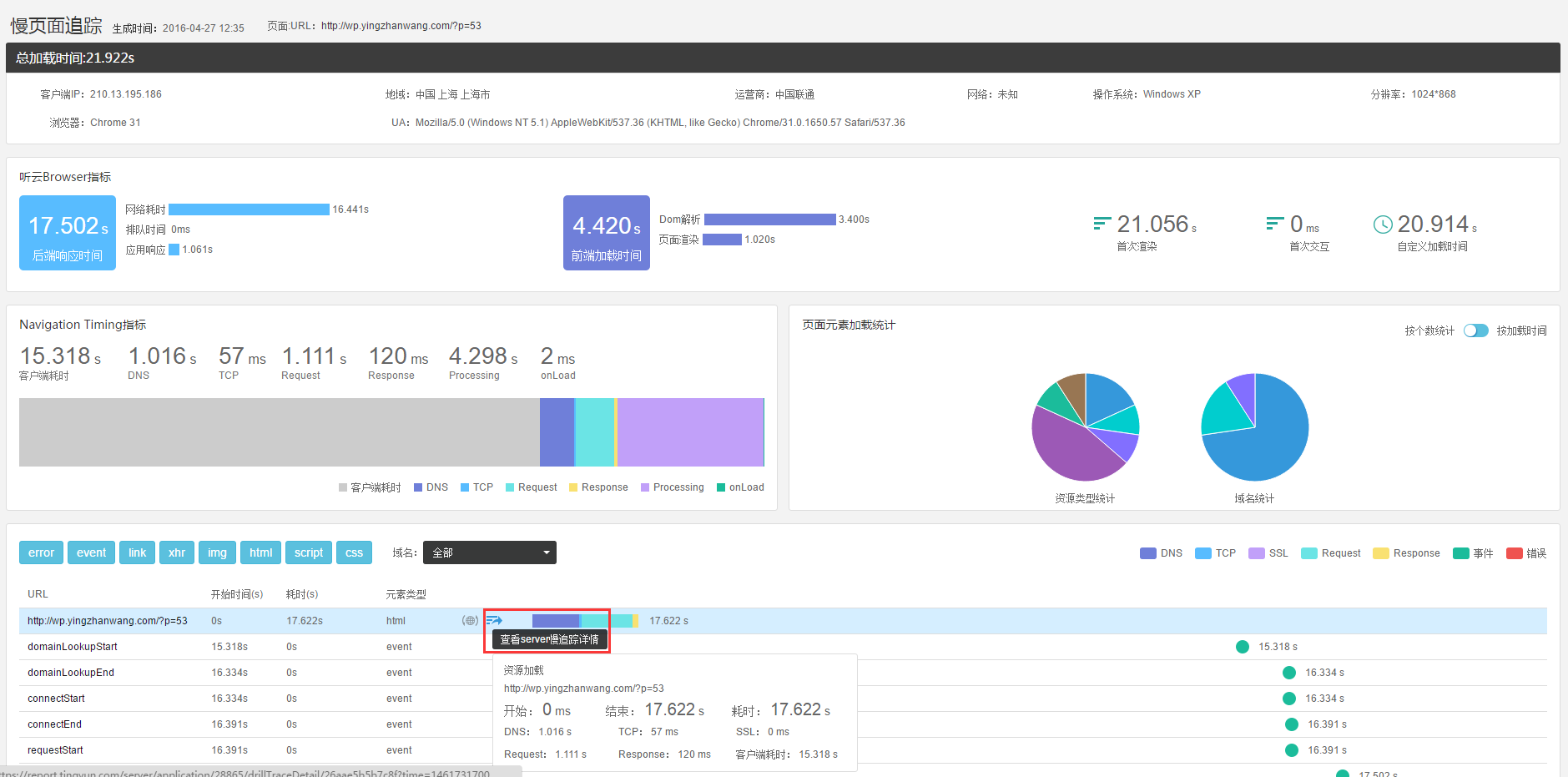 一般应用的性能损耗会发生在网页前端、网络以及后端服务器。听云Browser能够监测网页访问的性能情况,配合听云Server可以了解到服务器端响应的性能损耗。