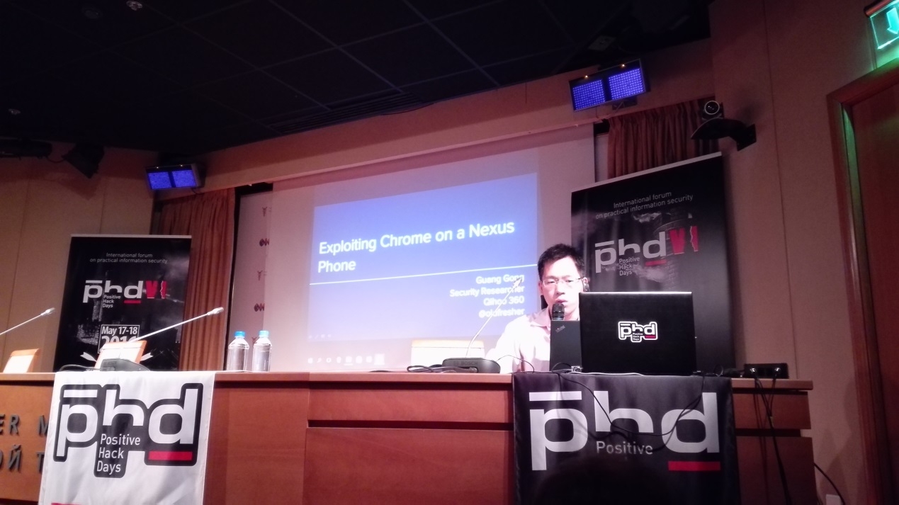 为期两天的2016PHDays峰会昨日在莫斯科拉开帷幕,各国黑客精英、信息安全行业的领导者以及互联网界的代表纷纷前往参加。360手机卫士安全研究员龚广,一位热衷于挖掘安卓系统漏洞,并且在去年是全球唯一一位在黑客大赛上成功攻破N6手机的白帽黑客,受邀参加了此次峰会,发表关于如何利用Chrome漏洞攻破Nexus手机的演讲,与大家共同讨论业内信息安全相关的最热门的话题。