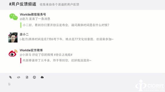 比如对于用户反馈的实时监控和回复,可以将微信公众号、微博、工单系统、社区以及App Store 等服务全部绑定到用于收集用户反馈的群组【用户反馈频道】,这样就可以在一个群组内收集到上述各个渠道的反馈,并且可以按照对应的格式直接在Worktile 企业版完成回复,而不需要再到各个工具中去逐一的反馈。
