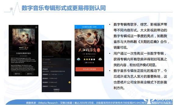 数字专辑形式多样,有歌手、综艺、影视原声带等不同内容形式。这个季度,酷我音乐在《太阳的后裔》还未播出的情况下,大胆签下《太阳的后裔》原声带。随着《太阳的后裔》太热,数字专辑的销量也随之不断攀升。在酷我音乐平台上,《太阳的后裔》累计销售已超过20万张,这个数字还在不断增长。