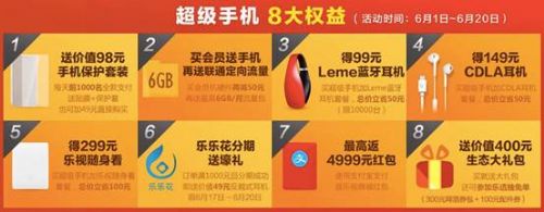 在乐视官方商城,在乐视官方商城方面,从6月1日起,购买超级手机将可以拥有8大权益,这些权益分别为6.1-6.20每天前1000名支付送价值98元手机保护套装、买会员机关联海量联通定向流量等。如旗舰杀手乐2,此次生态618活动价仅为1147元,这个价格不仅含有硬件价格1099元,二次元会员价198元,可以获得价值400元的生态礼包。