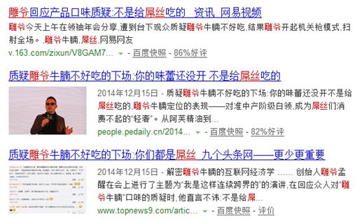 雕爷的任性不只在面对自己的员工,对于外界的质疑,更是不顾形象不顾场合地张口就来。2014年年底的互联网大会上,面对记者提出的“雕爷牛腩不好吃”,雕爷激烈回应:“你要是每天去吃三五块钱的盒饭,你当然觉得雕爷牛腩不好吃了,你记忆里全是屌丝、妈妈的味道。”对于雕爷这种任性妄为、缺乏公关意识的行为,俏猫COO张铭恒表示,这不只伤害了他的个人形象,更祸及雕爷牛腩甚至河狸家的品牌形象。