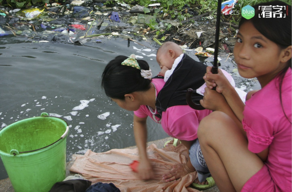 随着电子垃圾产业在贵屿快速发展,当地河流遭遇了严重污染,民众生活用水成了头号难题。当地居民需要在“黑河”边洗衣服,回家后再用井水过滤一遍。图为2005年12月13日,一名打工女子背着婴儿在“黑河”边洗衣服,另一位女孩为她撑伞挡雨。