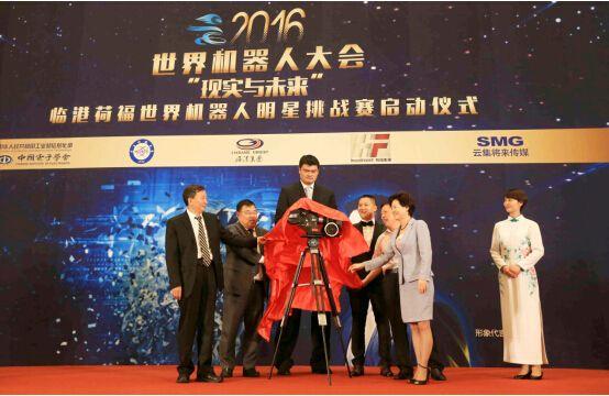 工业和信息化部、中国科学技术协会、2016世界机器人大会秘书长徐晓兰、明星挑战赛负责人荷福集团董事长周锦霆、电子科技大学校长李言荣、上海临港集团总裁袁国华、着名投资人吴鸣霄、巨星姚明等出席并致辞。徐晓兰、周锦霆、李言荣、袁国华与姚明共同揭牌启动挑战赛。