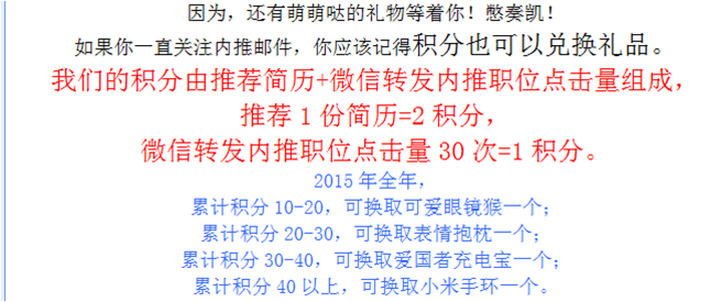 那我们相信内推并不是简单的一份简历收集的过程,而是有情有义地获得高潜人才的一个过程。因此必须对内部员工或内部推荐的员工进行及时有效的奖励。例如我们奖励一些现金,除此之外,可以奖励一些小礼品,奖励一些休假等。在相关的激励奖励之后,很多员工会更有兴趣或积极主动地在他的朋友圈里进行分享这些内推的职位。