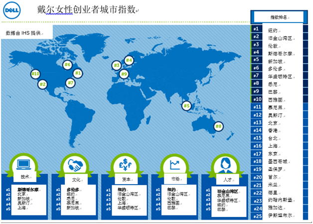 这是戴尔与IHS合作发起的首项全球范围的研究,旨在对多座城市对于高潜力女性企业家的吸引力和支持度进行评价。IHS是在深刻影响当今商业格局的行业洞察与分析方面的领先调研机构。该项研究是从戴尔的未来就绪经济体(FRE)模型下的50座全球城市中选出25座进行排名,旨在两个指标之间进行对比,并将地理多元性作为一项重要的城市选择标准。