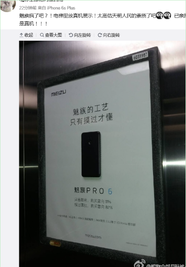 前段时间,不少北京的网友发现,魅族在一些写字楼电梯中,投放了PRO 6的广告。海报的中间画了PRO 6手机的轮廓,写有“手机遗失也只能说明工艺太好,谁都想据为己有”的文案。