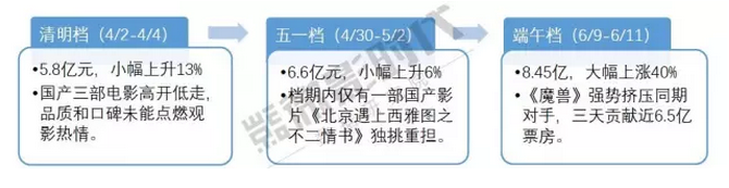 第二季度的单日最高成绩和次高成绩出现在6月9日的3.7亿元和5月7日的3.0亿元,分别是《魔兽》和《美国队长3》的开画次日(周六)。而五月中下旬的工作日票房十分惨淡,在4000万左右徘徊。