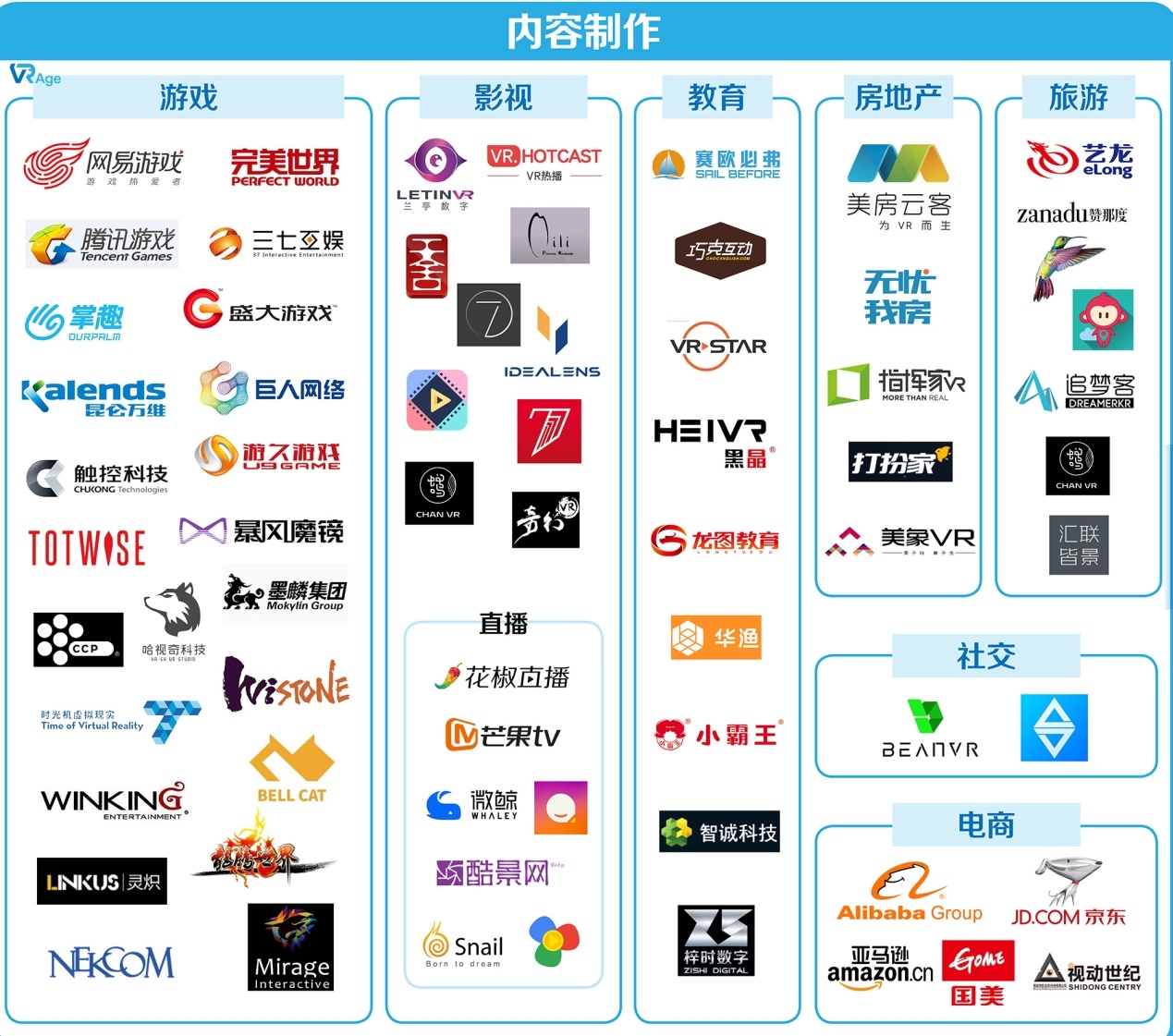这部分主要是介绍VR在各个领域的应用,除了游戏和影视这两个大的板块外,还罗列了VR在教育、房地产、旅游、社交和电商等领域进行研发的公司。