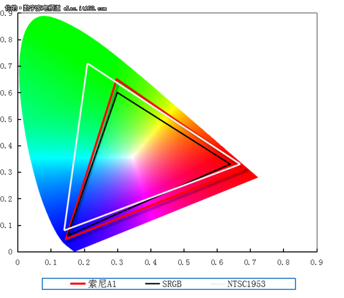 经过专业仪器BM-7测试,索尼A1无论是亮场还是黑场的分数都明显高于市面上绝大多数HDR机型,亮度方面表现非常优秀。实测92.21%的实测NTSC色域值(数值供参考,不同设备测试数值会有所不同,当然还是要靠实际的画质表现力来说话的),明显高于普通电视75%左右的色域范围,因此能够看到色域图中在绿、红色区域范围明显更广域。