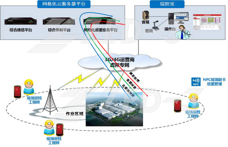 系统由巡视子系统、事件处置子系统、集群通信子系统和数据分析与存储子系统组成,将整个巡检区域划分为若干个责任网格,每个网格内设置巡检点并设有NFC加密巡检电子标签。现场人员定期巡检所辖网格,用智能终端读加密NFC标签,采集巡检数据并自动上报客户端,调度台可实时监控其巡检状态。巡检过程中一旦发现故障,巡检员可以通过智能终端,以文字、图片、视频等方式上报客户端系统,调度台收到报障信息后,及时转送并协调相关人员进行事件处置。对现场已解决的事件,客户端将进行核实销号,未解决的事件将被重新挂起,实现故障处置的闭环管理。