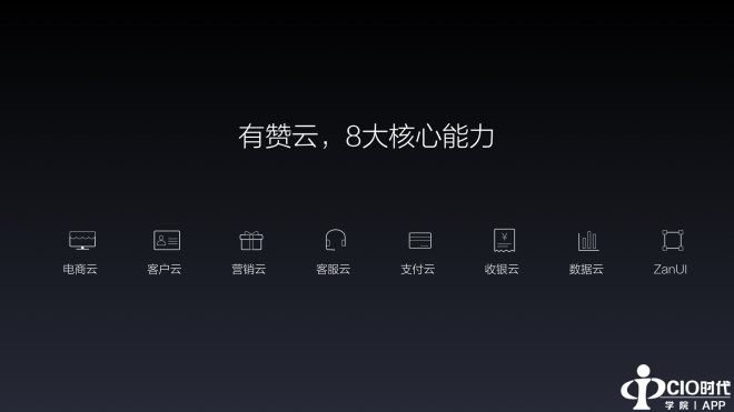 今次开放的有赞云包含八大核心能力:服务于全行业的商城和平台类产品的电商云、服务于全渠道客户管理的客户云、解决纳新客和留老客的营销云、在线服务都需要的客服云、让收付款更简单灵活的支付云和收银云,以及全行业BI都需要的数据云,和工程师都会用的ZanUI。