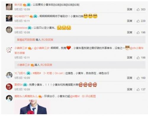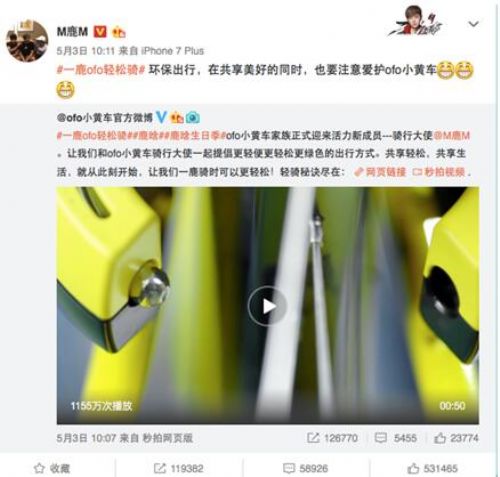 5月3日,共享单车原创者和领骑者ofo小黄车官方微博发布了“鹿晗代言ofo小黄车的全新宣传片”,骑行大使鹿晗随即主动转发,再次倡导环保共享出行的同时,也要注意爱护ofo小黄车,在不到24小时内获赞超53万,视频播放超1155万次。众多网友、粉丝直呼,“能跟小鹿欧巴用同款单车超兴奋,从此只骑小黄车,跟着我鹿一起保护小黄车。”